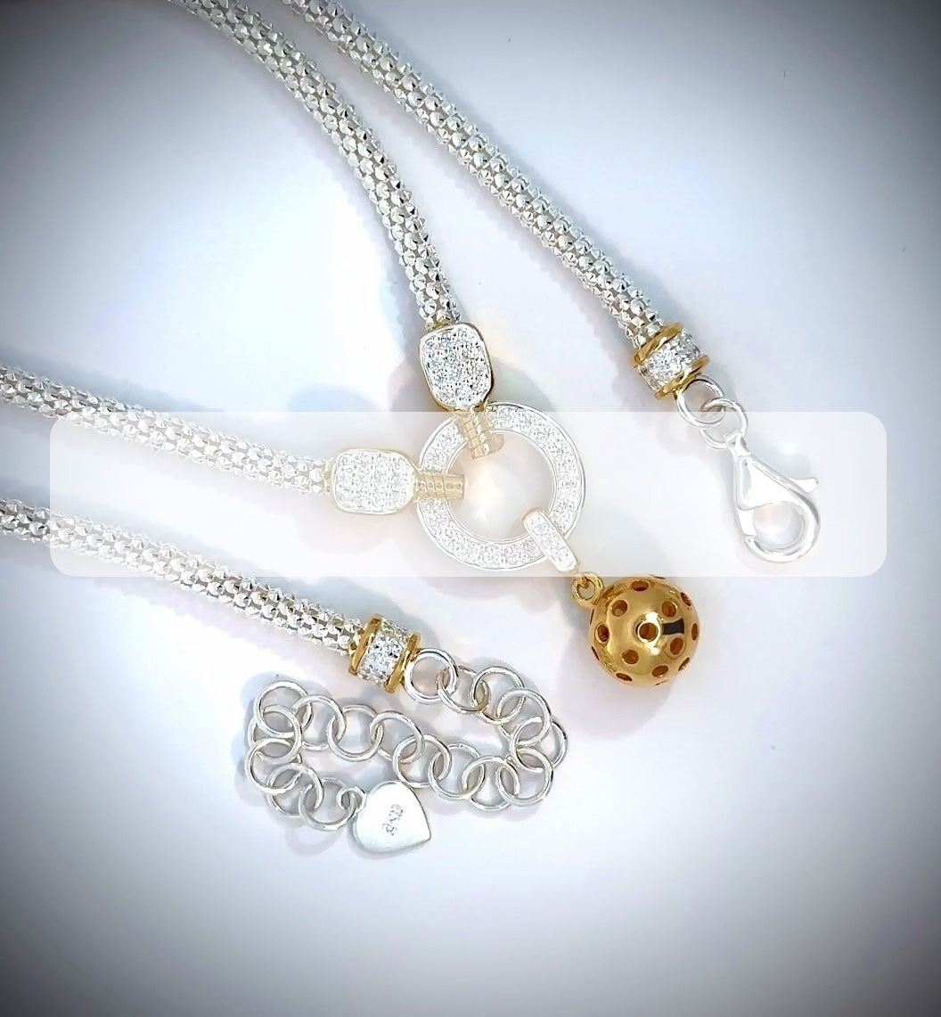 Discover premium pickleball jewelry in silver and gold. Shop necklaces, earrings, bracelets and charms inspired by paddles, balls, and courts. Uniquely designed for women, men, and children.